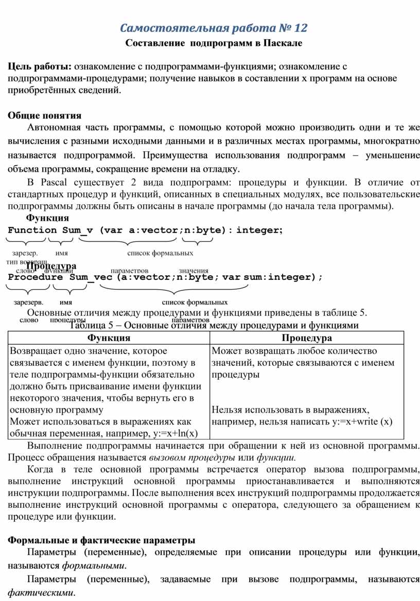 Таблица 5 - Основные отличия между процедурами и функциями