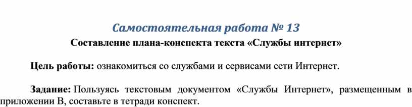 Задание: Пользуясь текстовым документом «Службы Интернет», размещенным в приложении В, составьте в тетради конспект.