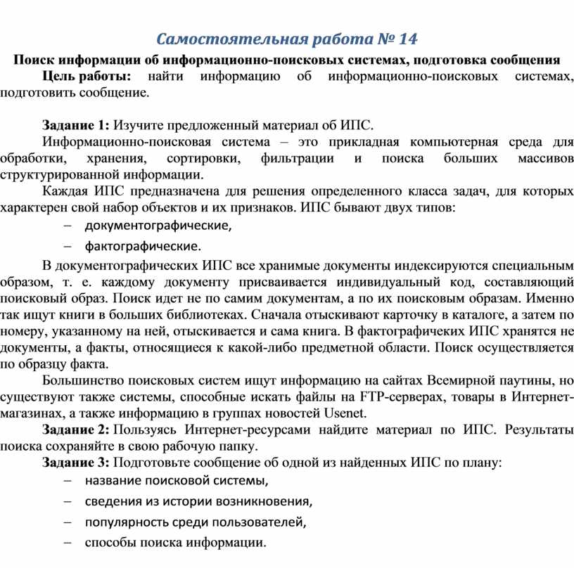 Цель работы: найти информацию об информационно-поисковых системах, подготовить сообщение.