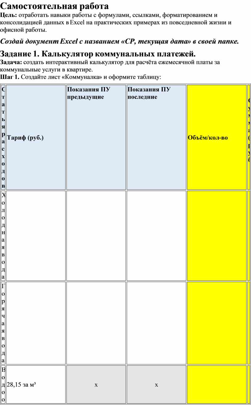 Цель: отработать навыки работы с формулами, ссылками, форматированием и консолидацией данных в Excel на практических примерах из повседневной жизни и офисной работы.