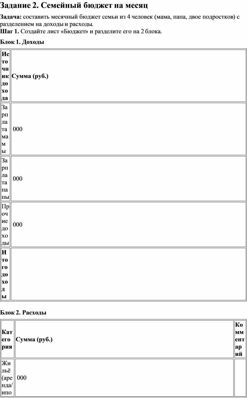 Задача: составить месячный бюджет семьи из 4 человек (мама, папа, двое подростков) с разделением на доходы и расходы.
