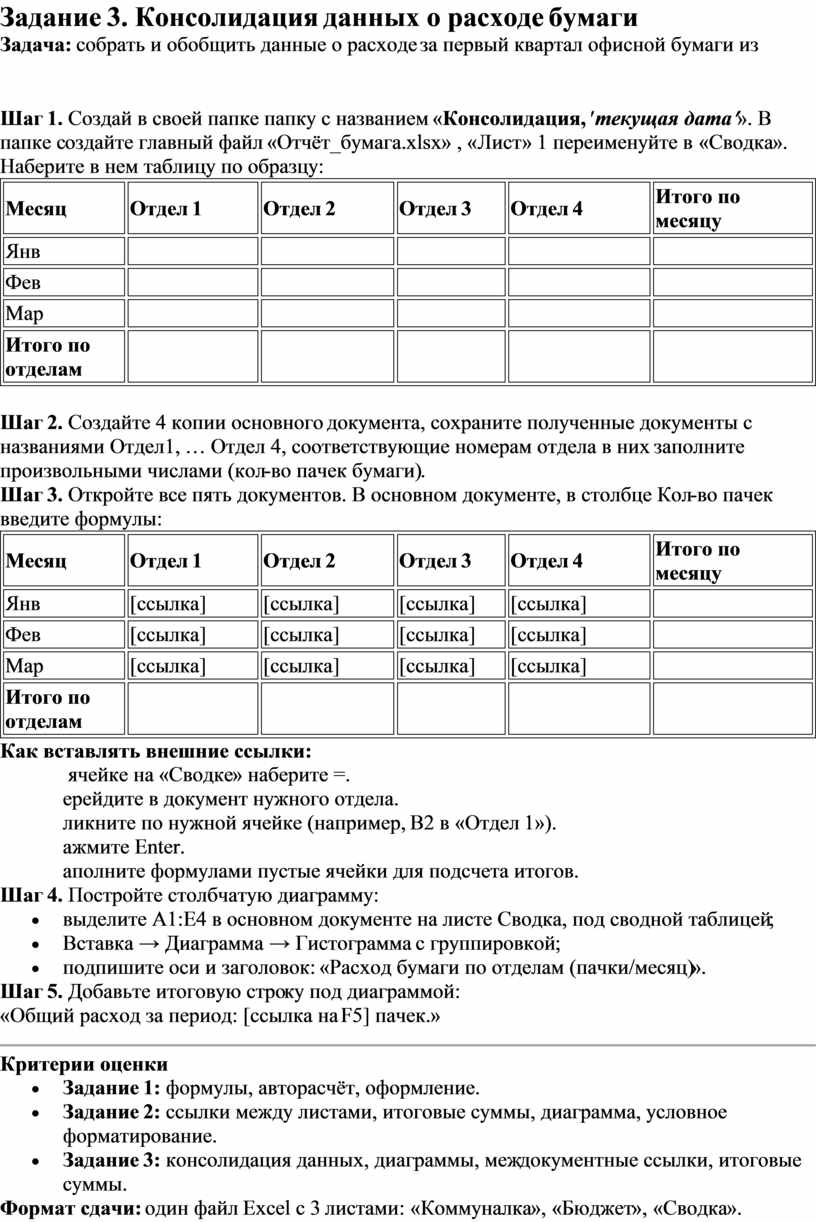 Задача: собрать и обобщить данные о расходе за первый квартал офисной бумаги из 4 отделов в единый отчёт.