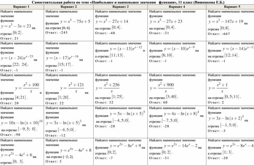 Самостоятельная работа по теме «Наибольшее и наименьшее значения функции», 11 класс (Вишнякова Е.Б.)