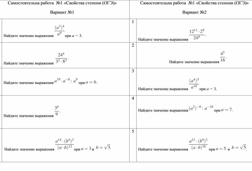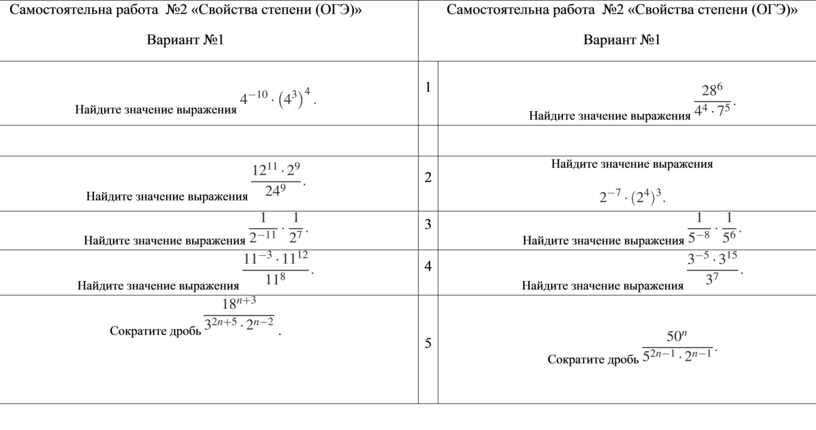 Самостоятельна работа №1 «Свойства степени (ОГЭ)» Вариант №1 |