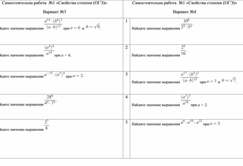 Самостоятельна работа №1 «Свойства степени (ОГЭ)» Вариант №3 |