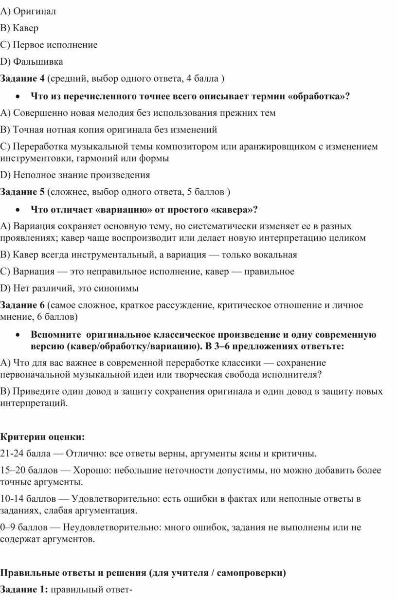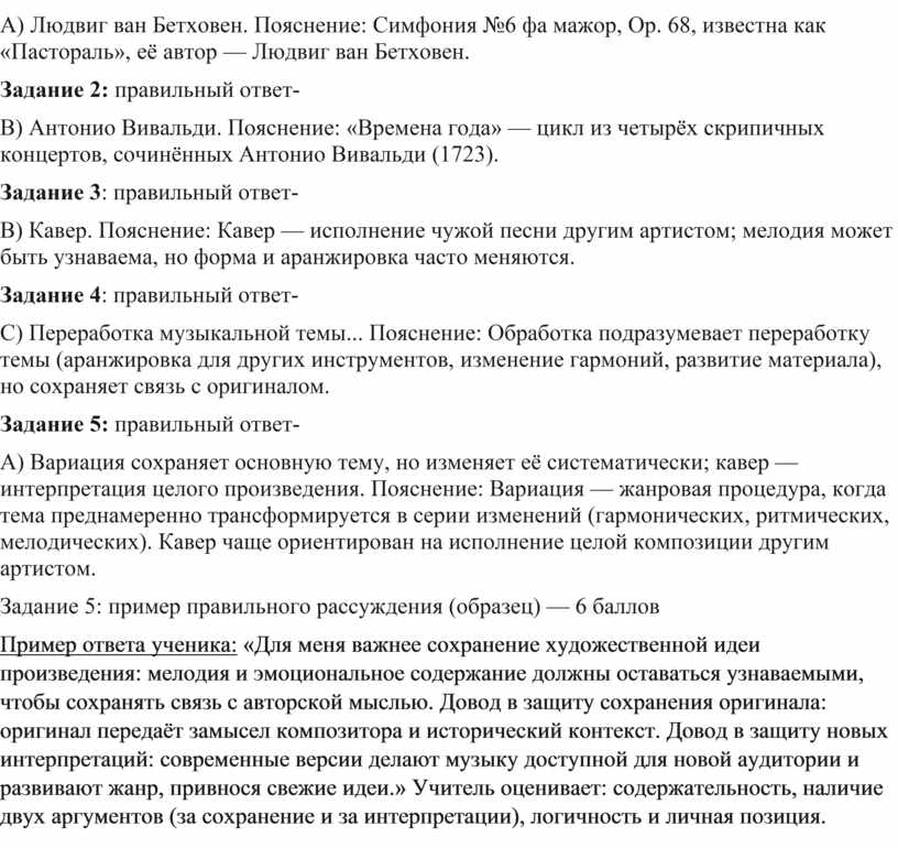 Пример ответа ученика: «Для меня важнее сохранение художественной идеи произведения: мелодия и эмоциональное содержание должны оставаться узнаваемыми, чтобы сохранять связь с авторской мыслью. Довод в защиту сохранения оригинала: оригинал передаёт замысел композитора и исторический контекст. Довод в защиту новых интерпретаций: современные версии делают музыку доступной для новой аудитории и развивают жанр, привнося свежие идеи.» Учитель оценивает: содержательность, наличие двух аргументов (за сохранение и за интерпретации), логичность и личная позиция.