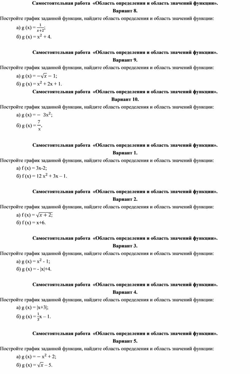 Самостоятельная работа «Область определения и область значений функции».