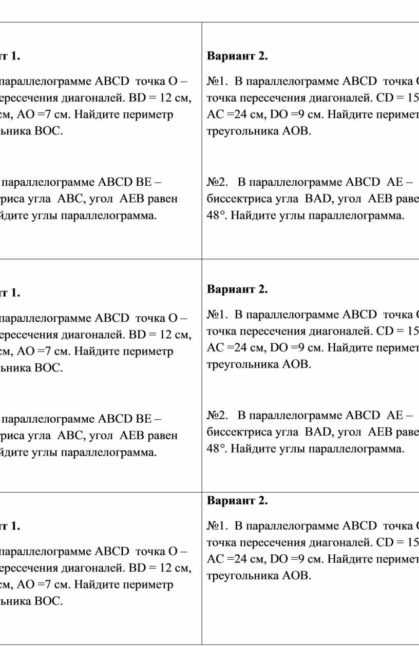 Вариант 1. №1. В параллелограмме ABCD точка O – точка пересечения диагоналей. BD = 12 см, AD =8 см, AO =7 см. Найдите периметр треугольника BOC.