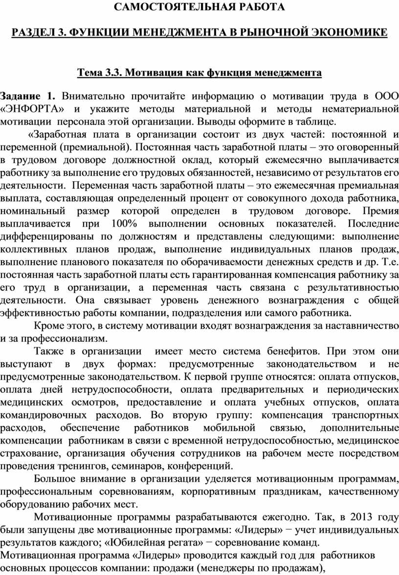 Задание 1. Внимательно прочитайте информацию о мотивации труда в ООО «ЭНФОРТА» и укажите методы материальной и методы нематериальной мотивации персонала этой организации. Выводы оформите в таблице.