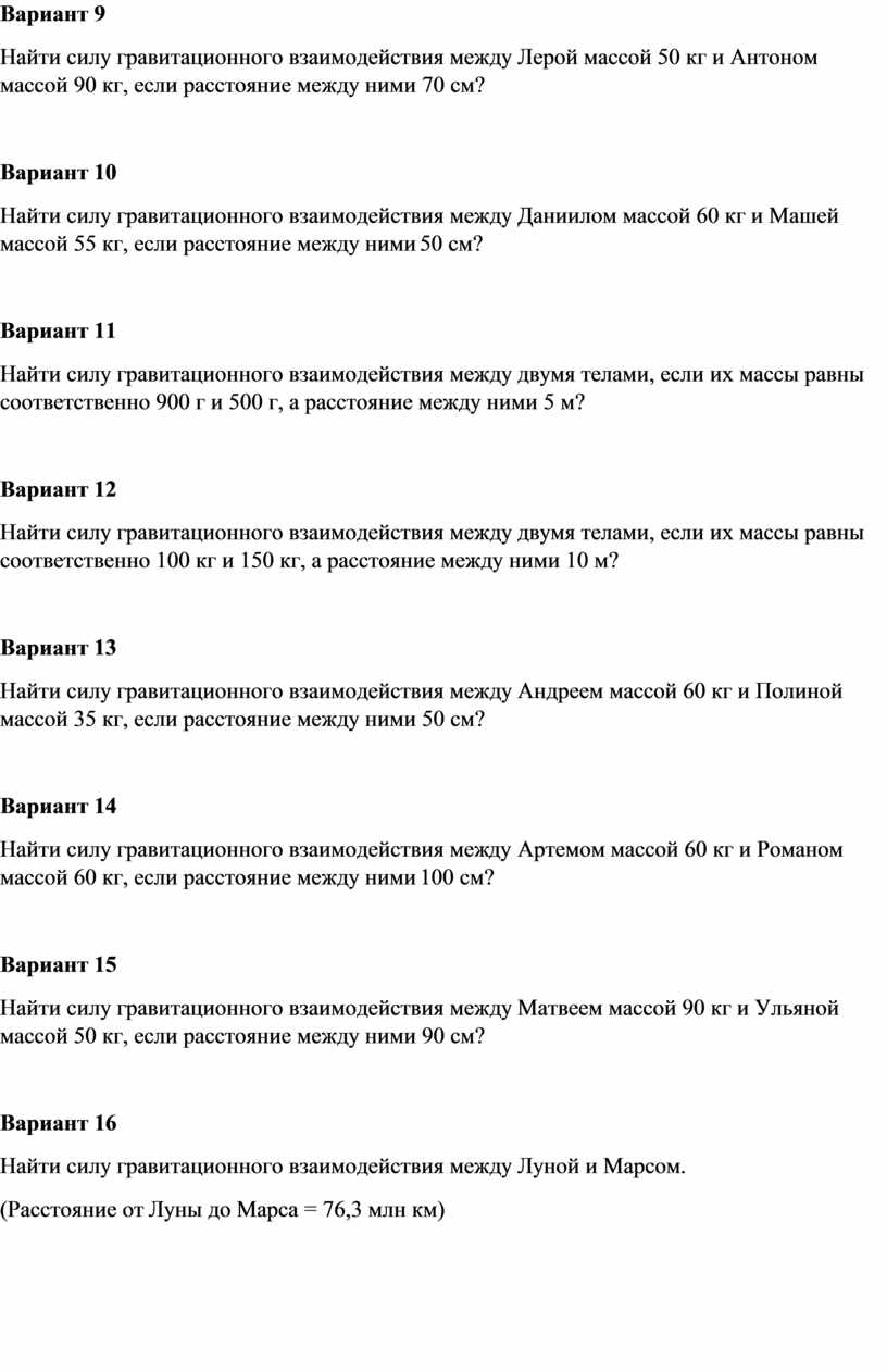 Найти силу гравитационного взаимодействия между Матвеем массой 90 кг и Ульяной массой 50 кг, если расстояние между ними 90 см?