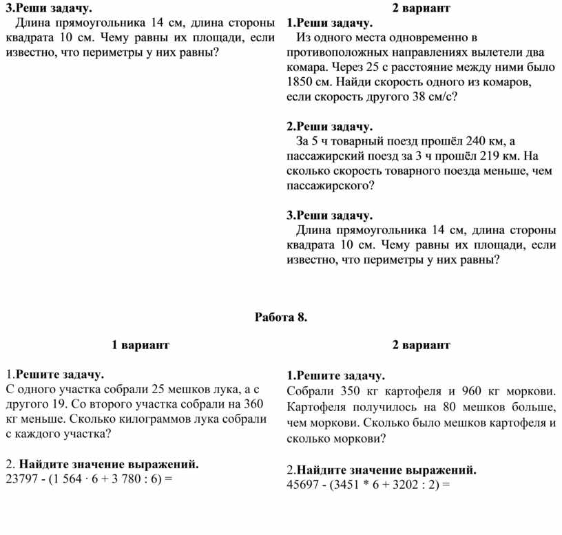 3.Реши задачу. Длина прямоугольника 14 см, длина стороны квадрата 10 см. Чему равны их площади, если известно, что периметры у них равны?