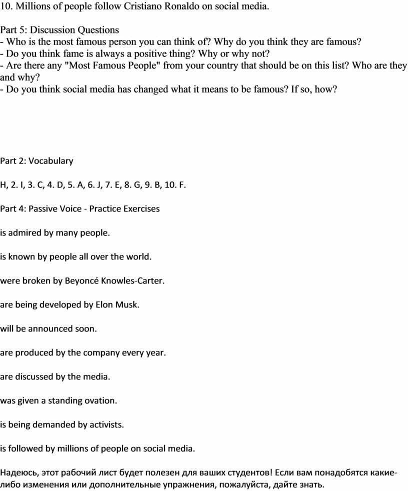 Надеюсь, этот рабочий лист будет полезен для ваших студентов! Если вам понадобятся какие-либо изменения или дополнительные упражнения, пожалуйста, дайте знать.