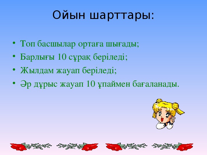 • Әр дұрыс жауап 10 ұпаймен бағаланады.
