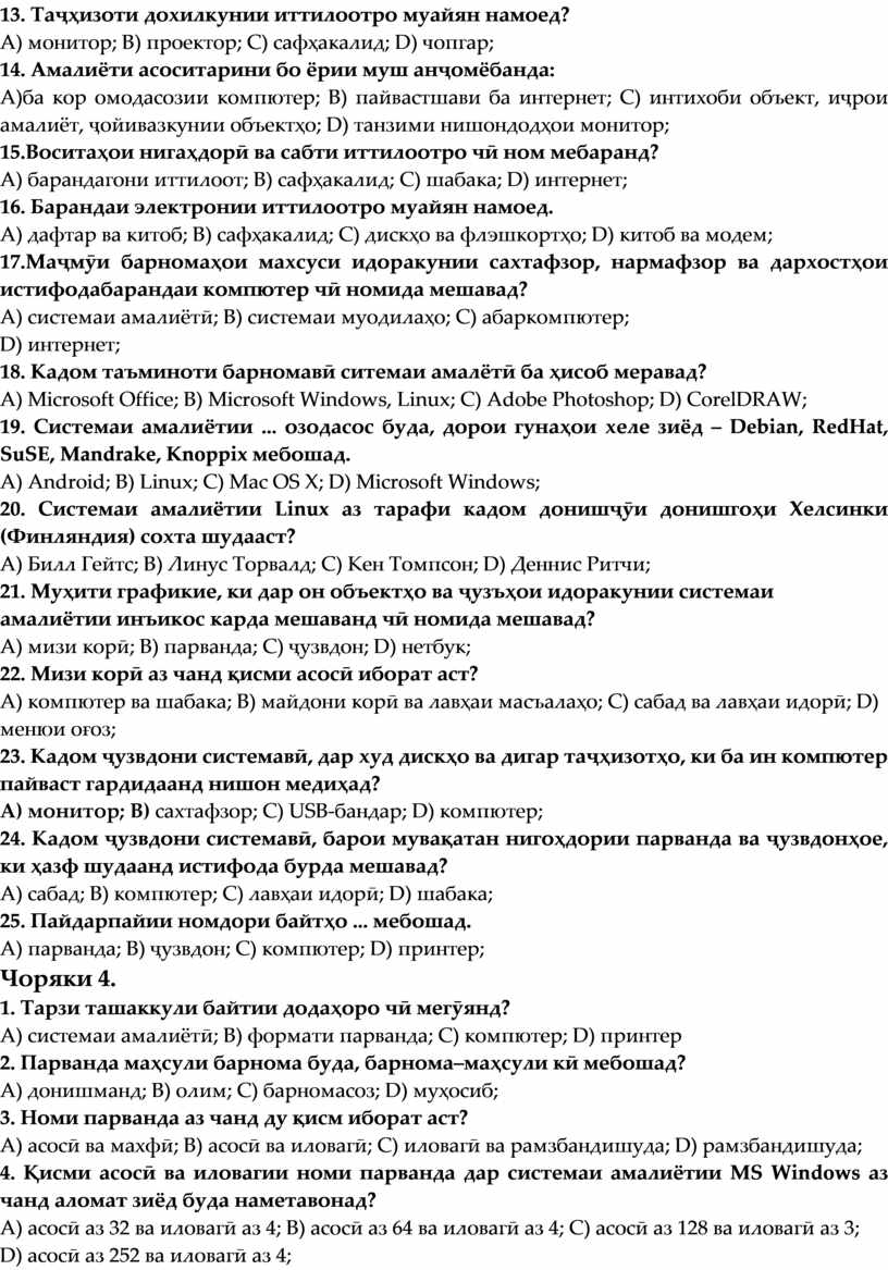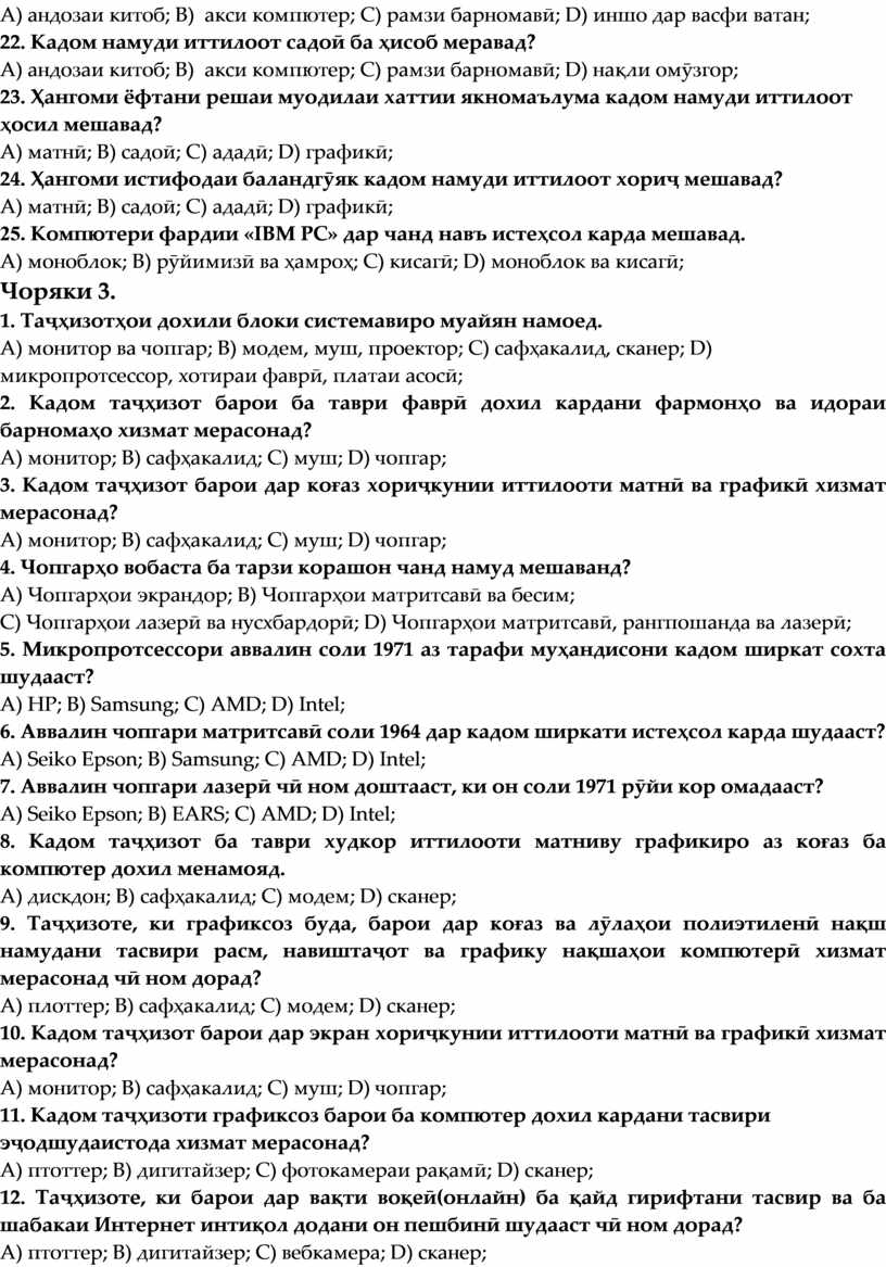 A) ҷузвдон; B) сканер; В) чопгар; D) системаи амалиётӣ;