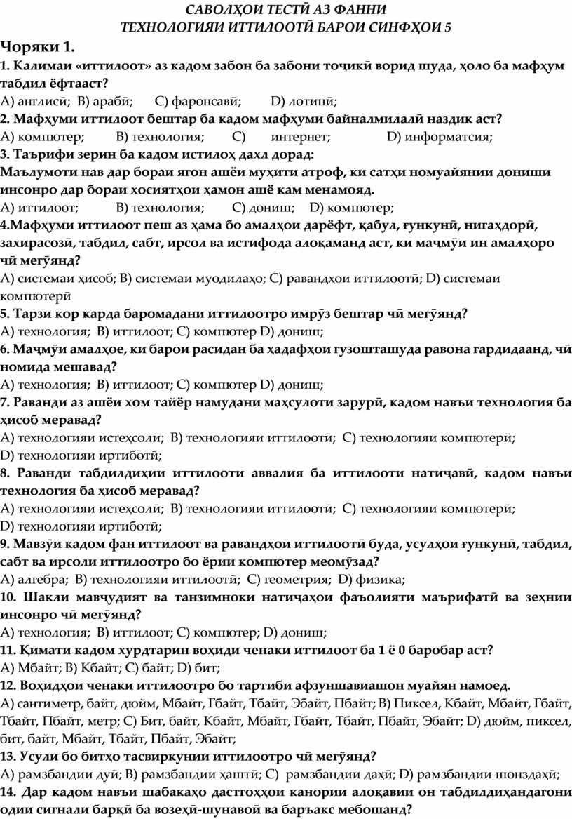 A) технология; B) иттилоот; C) компютер; D) дониш;