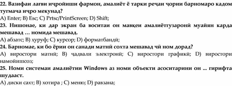 21. Барои чопи иттилооти ҷории экран ё нусхабардории иттилооти мавҷудаи экран ва ба буфери мубодила равон кардани он кадом тугмача хизмат мерасонад?