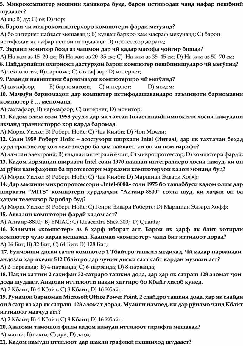 16. Калимаи «компютер» аз 8 ҳарф иборат аст. Барои як ҳарф як байт хотираи компютер ҷудо карда мешавад. Калимаи «компютер» чанд бит иттилоот дорад?