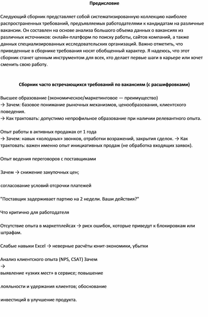 Следующий сборник представляет собой систематизированную коллекцию наиболее распространенных требований, предъявляемых работодателями к кандидатам на различные вакансии. Он составлен на основе анализа большого объема данных о вакансиях из различных источников: онлайн-платформ по поиску работы, сайтов компаний, а также данных специализированных исследовательских организаций. Важно отметить, что приведенные в сборнике требования носят обобщенный характер. Я надеюсь, что этот сборник станет ценным инструментом для всех, кто делает первые шаги в карьере или хочет сменить свою работу.