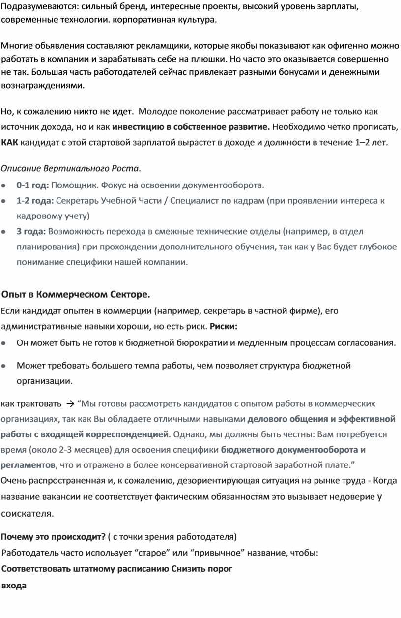 как трактовать → “Мы готовы рассмотреть кандидатов с опытом работы в коммерческих организациях, так как Вы обладаете отличными навыками делового общения и эффективной работы с входящей корреспонденцией. Однако, мы должны быть честны: Вам потребуется время (около 2-3 месяцев) для освоения специфики бюджетного документооборота и регламентов, что и отражено в более консервативной стартовой заработной плате.”