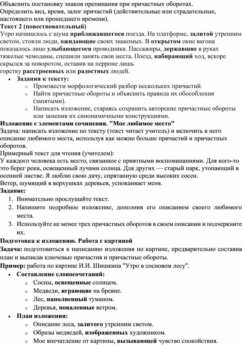 Задача: написать изложение по тексту (текст читает учитель) и включить в него описание любимого места, используя как можно больше причастий и причастных оборотов.
