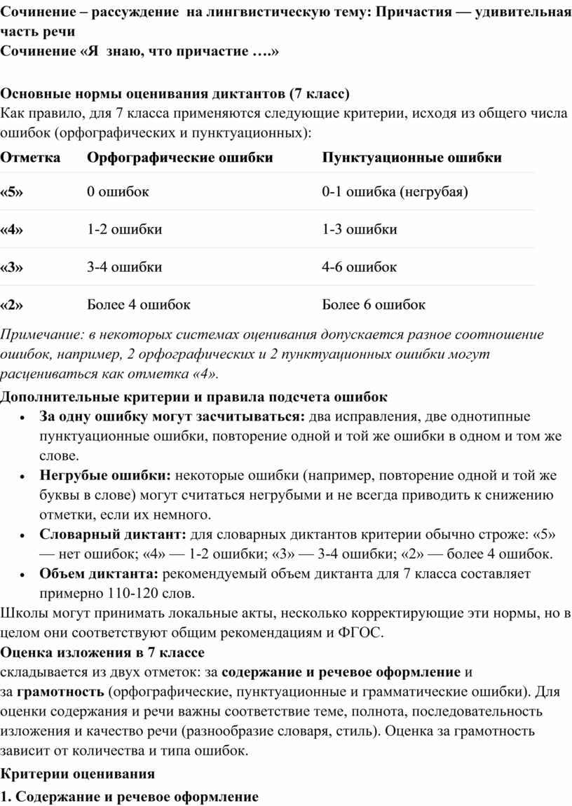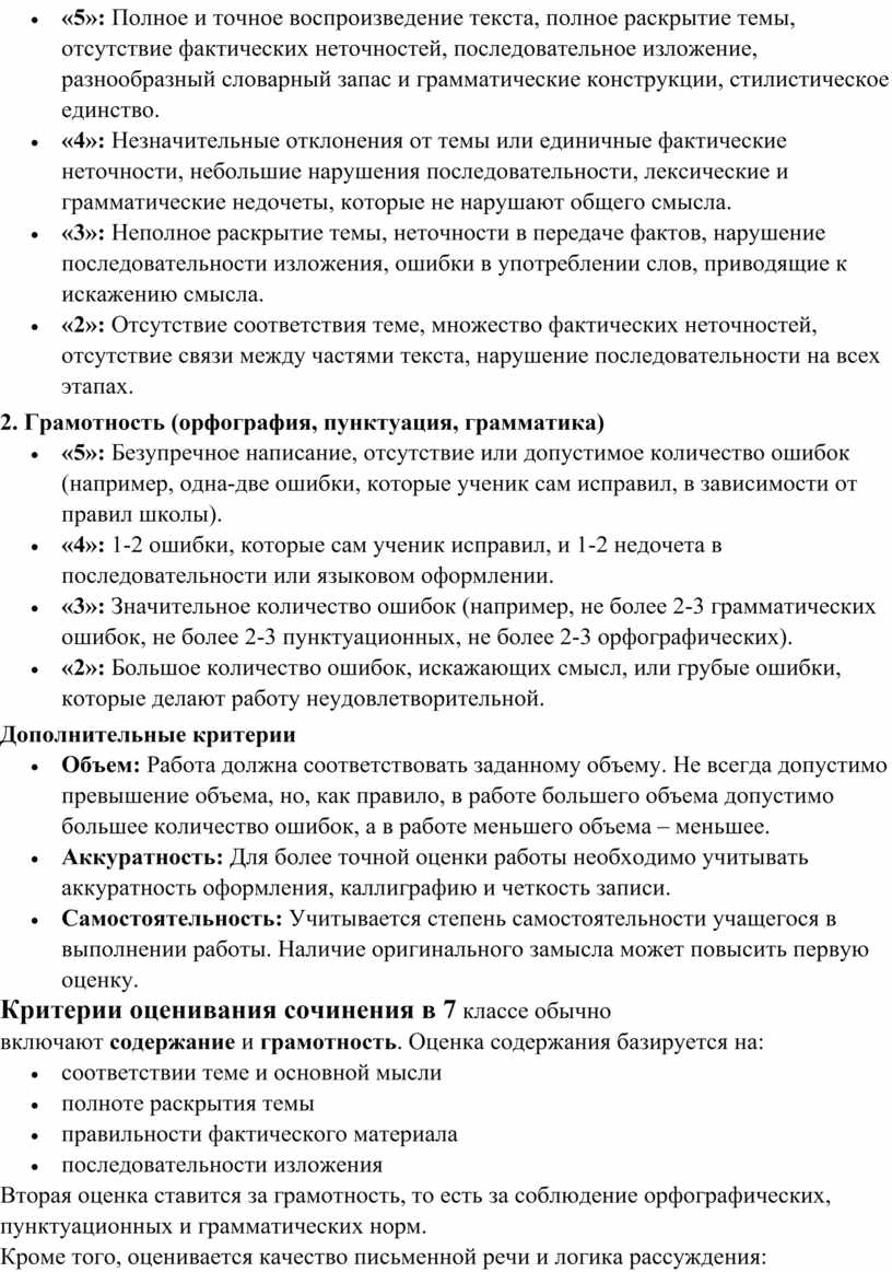 Критерии оценивания сочинения в 7 классе обычно включают содержание и грамотность. Оценка содержания базируется на: