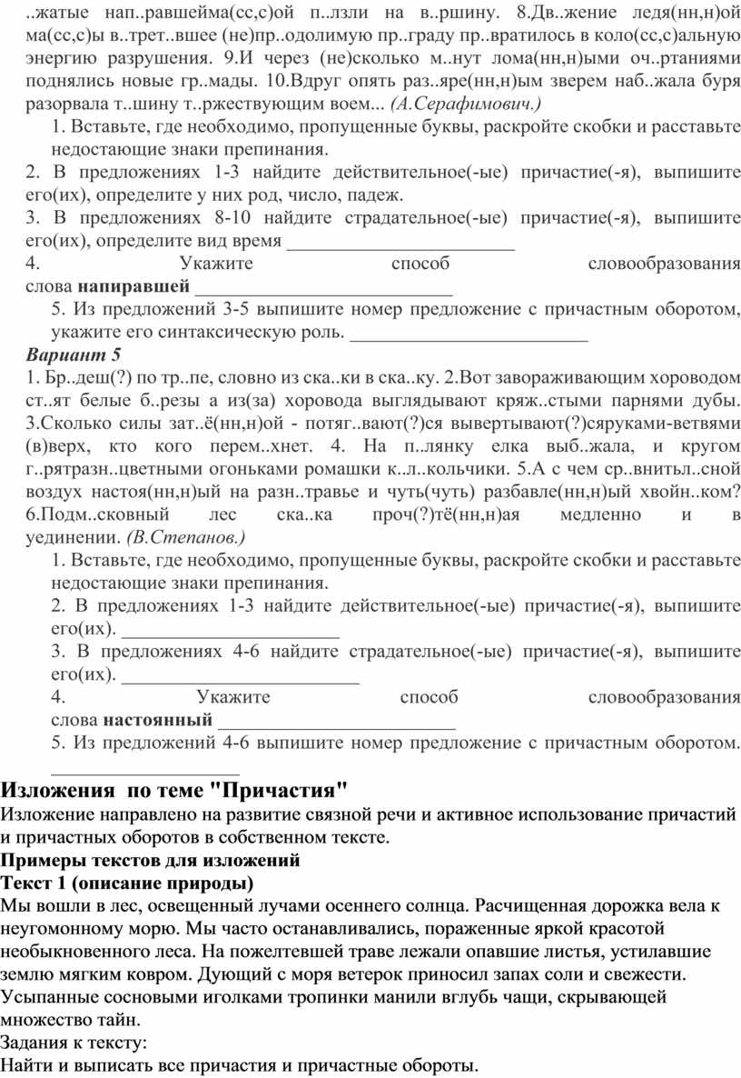 3. Изложения: тексты для сжатых и подробных изложений с заданиями по теме (например, найти причастия, заменить причастный оборот синонимичным выражением и т.д.).