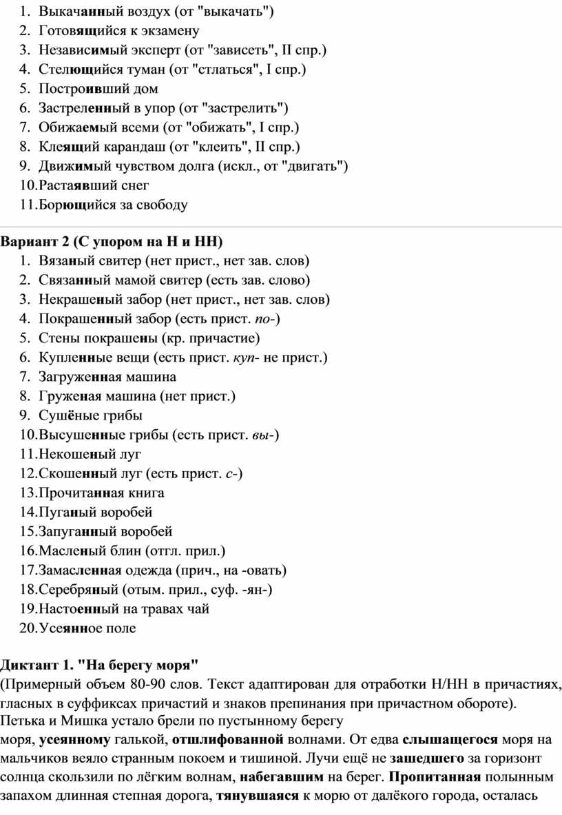 Этот диктант направлен на закрепление правил правописания гласных в суффиксах причастий, а также н и нн в причастиях и отглагольных прилагательных.