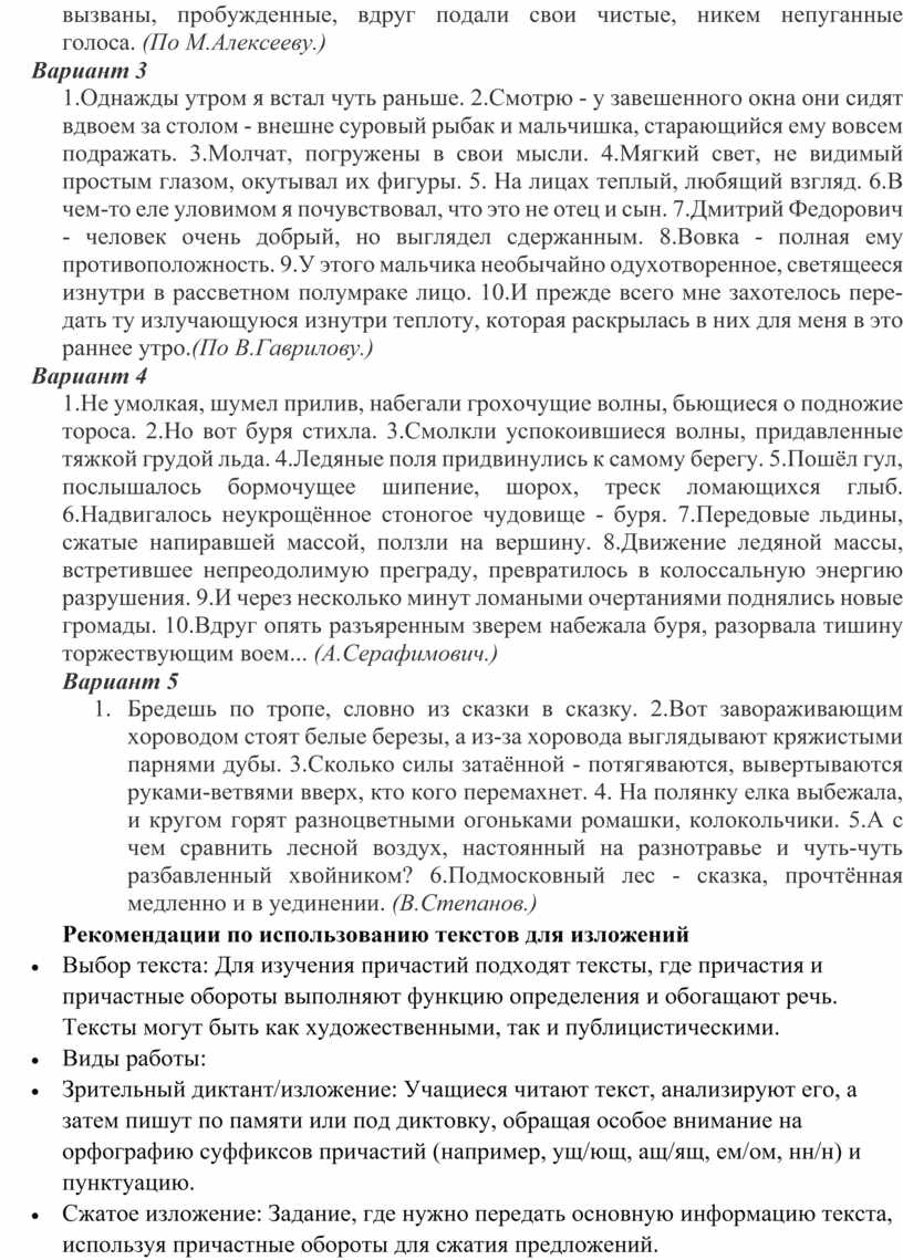 Эти тексты содержат различные виды причастий (действительные и страдательные, настоящего и прошедшего времени, полные и краткие), а также причастные обороты, что позволит отработать соответствующие правила орфографии и пунктуации.