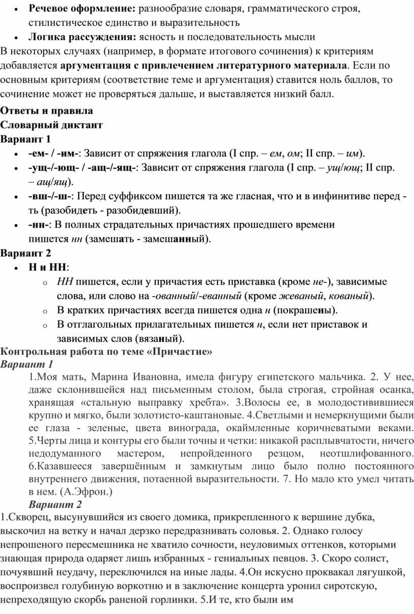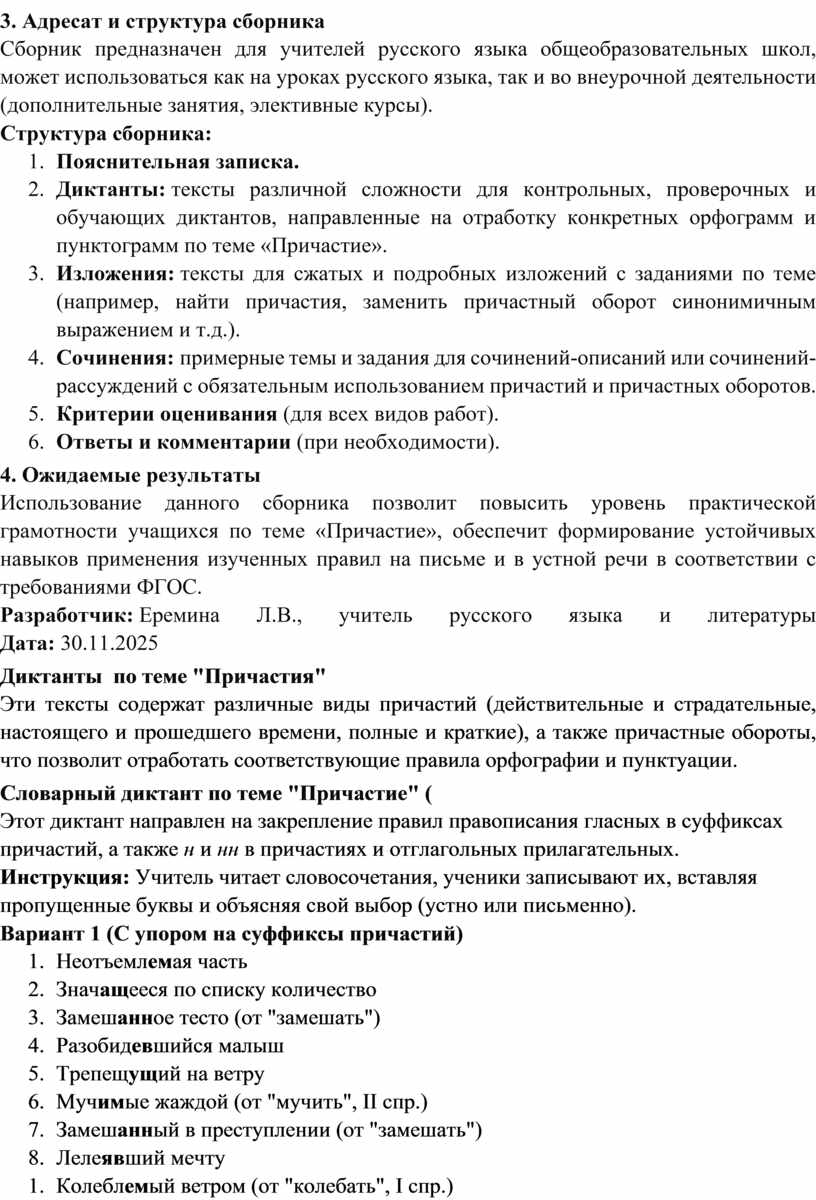 2. Диктанты: тексты различной сложности для контрольных, проверочных и обучающих диктантов, направленные на отработку конкретных орфограмм и пунктограмм по теме «Причастие».