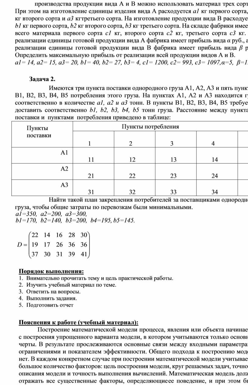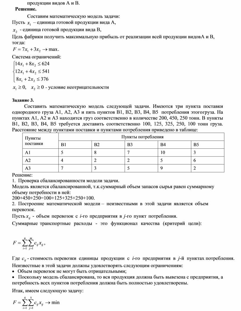 Составить математическую модель следующей задачи. Имеются три пункта поставки однородного груза А1, А2, А3 и пять пунктов В1, В2, В3, В4, В5 потребления этого груза. На пунктах А1, А2 и А3 находится груз соответственно в количестве 200, 450, 250 тонн. В пункты В1, В2, В3, В4, В5 требуется доставить соответственно 100, 125, 325, 250, 100 тонн груза. Расстояние между пунктами поставки и пунктами потребления приведено в таблице: