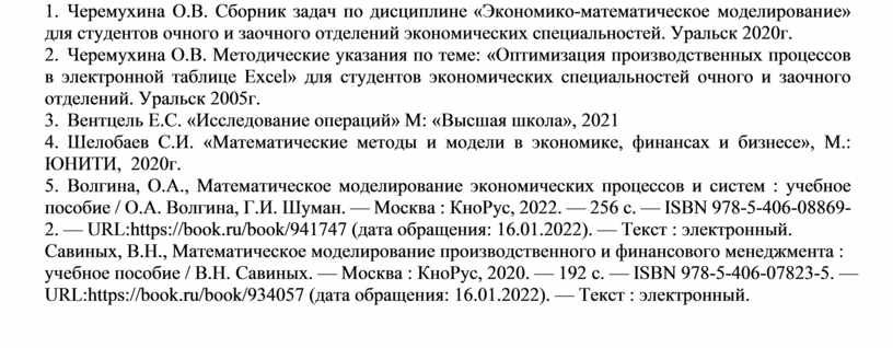 13. Волгина, О.А., Математическое моделирование экономических процессов и систем : учебное пособие / О.А. Волгина, Г.И. Шуман. — Москва : КноРус, 2022. — 256 с. — ISBN 978-5-406-08869-2. — URL:https://book.ru/book/941747 (дата обращения: 16.01.2022). — Текст : электронный.