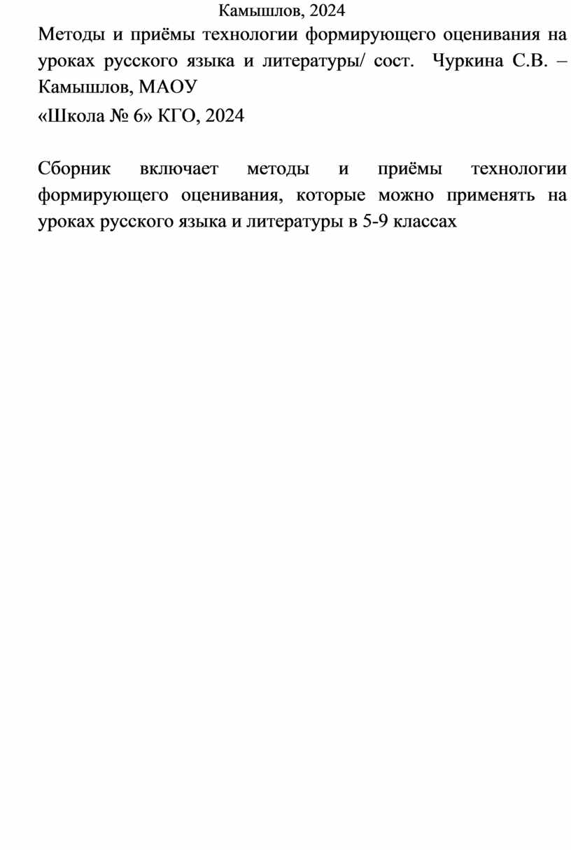 Методы и приёмы технологии формирующего оценивания на уроках русского языка и литературы/ сост. Чуркина С.В. – Камышлов, МАОУ
