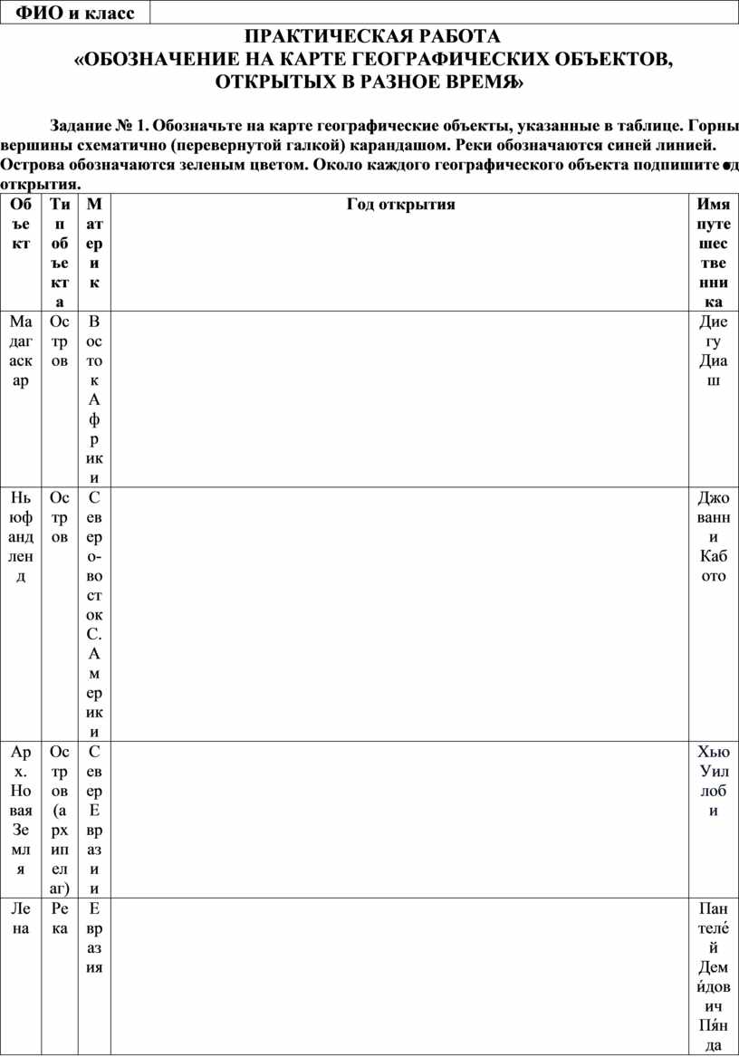 Задание № 1. Обозначьте на карте географические объекты, указанные в таблице. Горные вершины схематично (перевернутой галкой) карандашом. Реки обозначаются синей линией. Острова обозначаются зеленым цветом. Около каждого географического объекта подпишите год открытия.