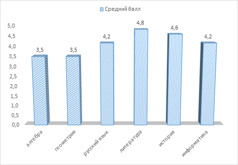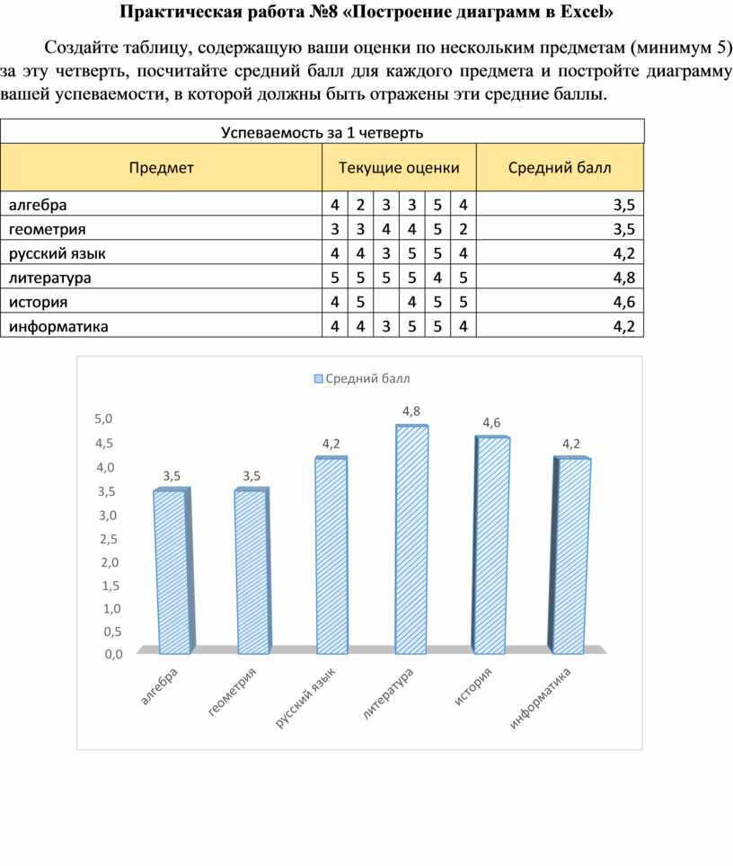 Создайте таблицу, содержащую ваши оценки по нескольким предметам (минимум 5) за эту четверть, посчитайте средний балл для каждого предмета и постройте диаграмму вашей успеваемости, в которой должны быть отражены эти средние баллы.
