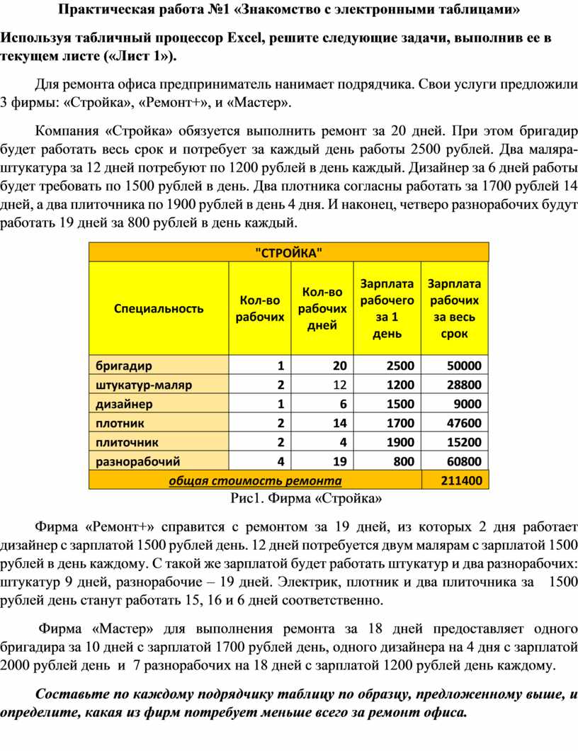 Составьте по каждому подрядчику таблицу по образцу, предложенному выше, и определите, какая из фирм потребует меньше всего за ремонт офиса.