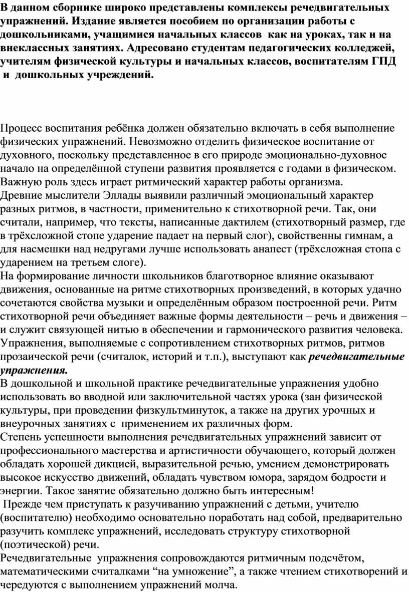 В данном сборнике широко представлены комплексы речедвигательных упражнений. Издание является пособием по организации работы с дошкольниками, учащимися начальных классов как на уроках, так и на внеклассных занятиях. Адресовано студентам педагогических колледжей, учителям физической культуры и начальных классов, воспитателям ГПД