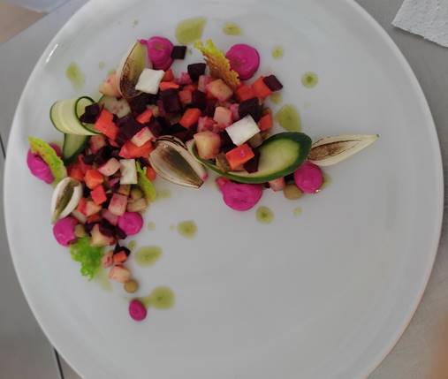 Овощи (свеклу, морковь, картофель отварить не очищая). Лук очистить промыть в холодной воде обсушить разделить на лепестки обжечь горелкой. Зелень промыть обсушить. Растительное масло взбить блендером с укропом. Вареные очищенные картофель, часть свеклы и морковь, очищенные соленые огурцы нарезают кубиком, горошек освободить от рассола. Свеклу смешать с зеленым маслом. Творожный сыр+сливки+свекла вареная взбить блендером массу пеложить в форму (кнели) заморозить. На тарелку разместить кольцо сервировочное, вокруг выложить винегрет, декорировать полосками свежего огурца, луком, кнелями и зеленым маслом.