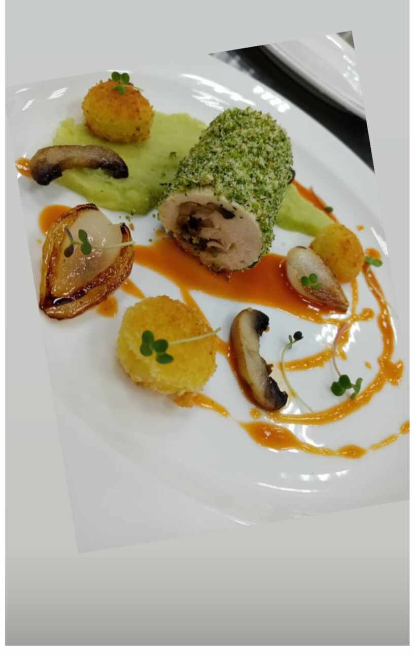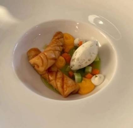 Яблоко нарезать дольками. На сковороде растопить сливочное масло, добавить сахар, яблоко и малину прогреть в карамели. Тесто фило раскатать, вырезать формой круг, положить малину, сформировать равиоль и запечь при t 180 3 мин. |
