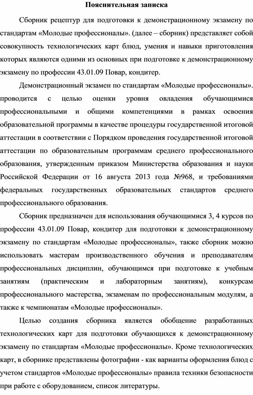 Сборник рецептур для подготовки к демонстрационному экзамену по стандартам «Молодые профессионалы». (далее – сборник) представляет собой совокупность технологических карт блюд, умения и навыки приготовления которых являются одними из основных при подготовке к демонстрационному экзамену по профессии 43.01.09 Повар, кондитер.