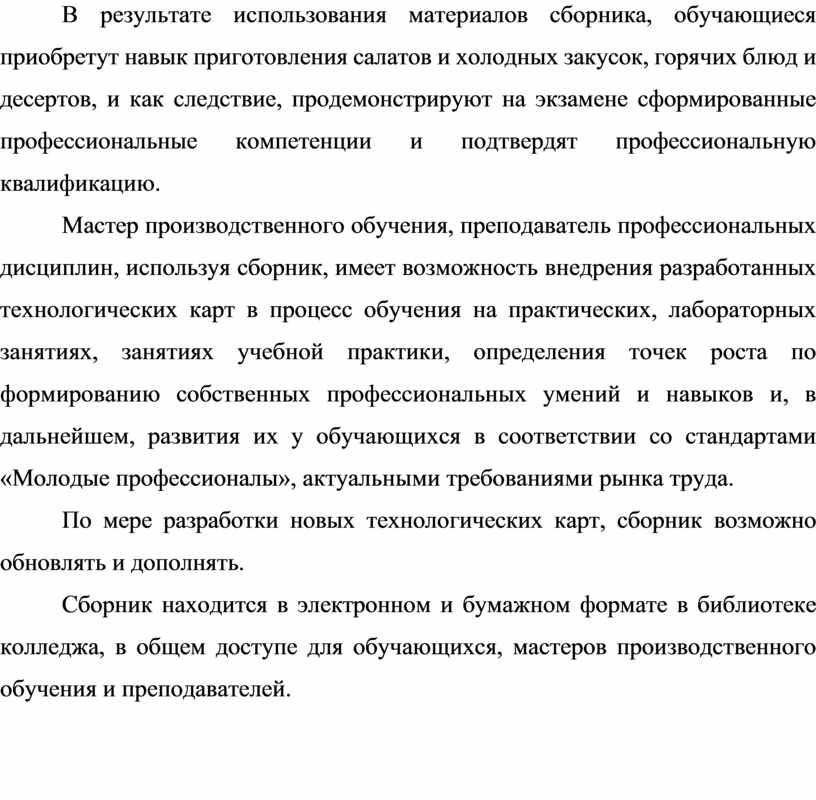 В результате использования материалов сборника, обучающиеся приобретут навык приготовления салатов и холодных закусок, горячих блюд и десертов, и как следствие, продемонстрируют на экзамене сформированные профессиональные компетенции и подтвердят профессиональную квалификацию.