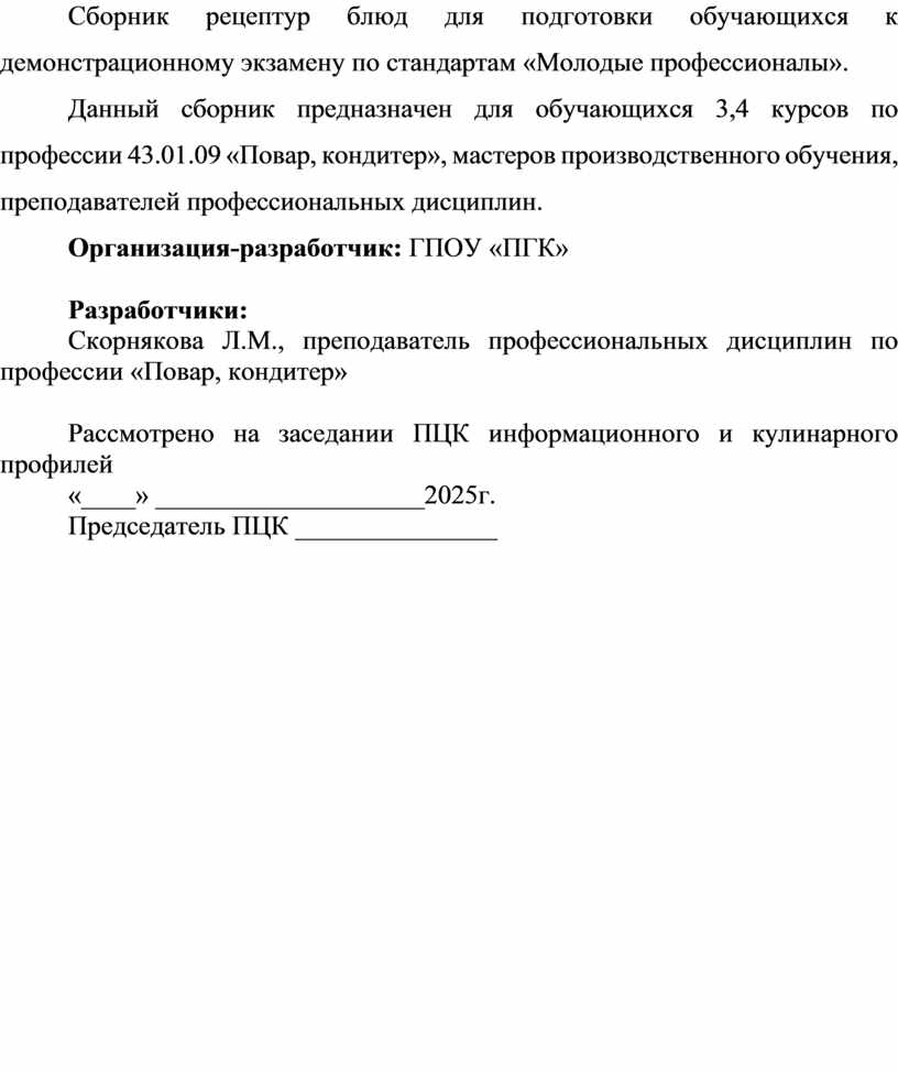 Данный сборник предназначен для обучающихся 3,4 курсов по профессии 43.01.09 «Повар, кондитер», мастеров производственного обучения, преподавателей профессиональных дисциплин.