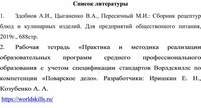 1. Здобнов А.И., Цыганенко В.А., Пересичный М.И.: Сборник рецептур блюд и кулинарных изделий. Для предприятий общественного питания, 2019г., 688стр.