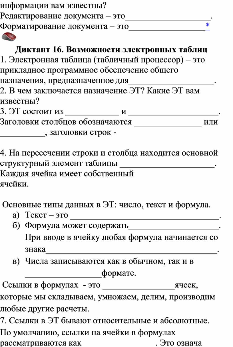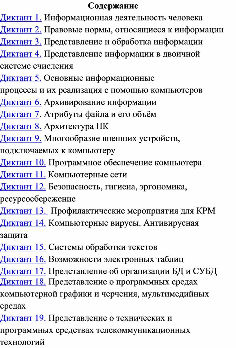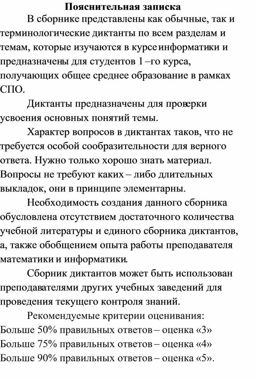 В сборнике представлены как обычные, так и терминологические диктанты по всем разделам и темам, которые изучаются в курсе информатики и предназначены для студентов 1 –го курса, получающих общее среднее образование в рамках СПО.