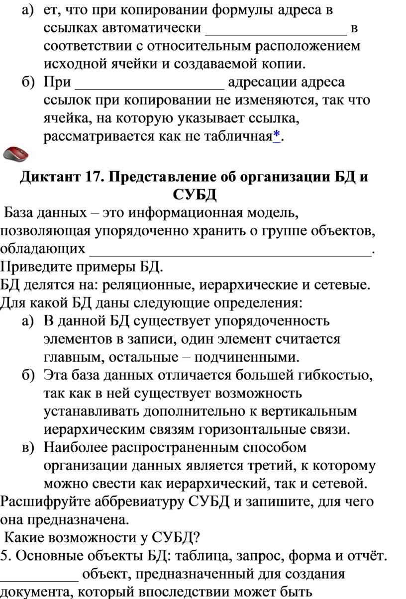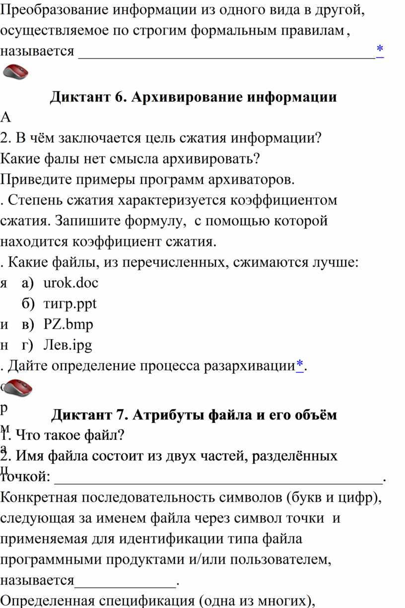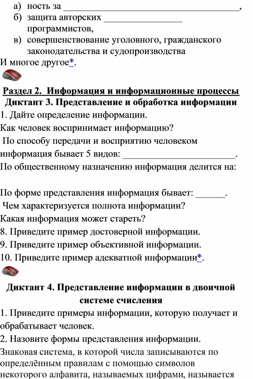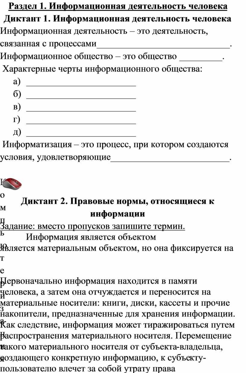 В сборнике представлены как обычные, так и терминологические диктанты по всем разделам и темам, которые изучаются в курсе информатики и предназначены для студентов 1 –го курса, получающих общее среднее образование в рамках СПО.