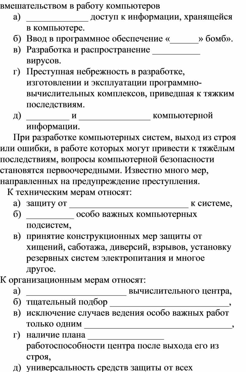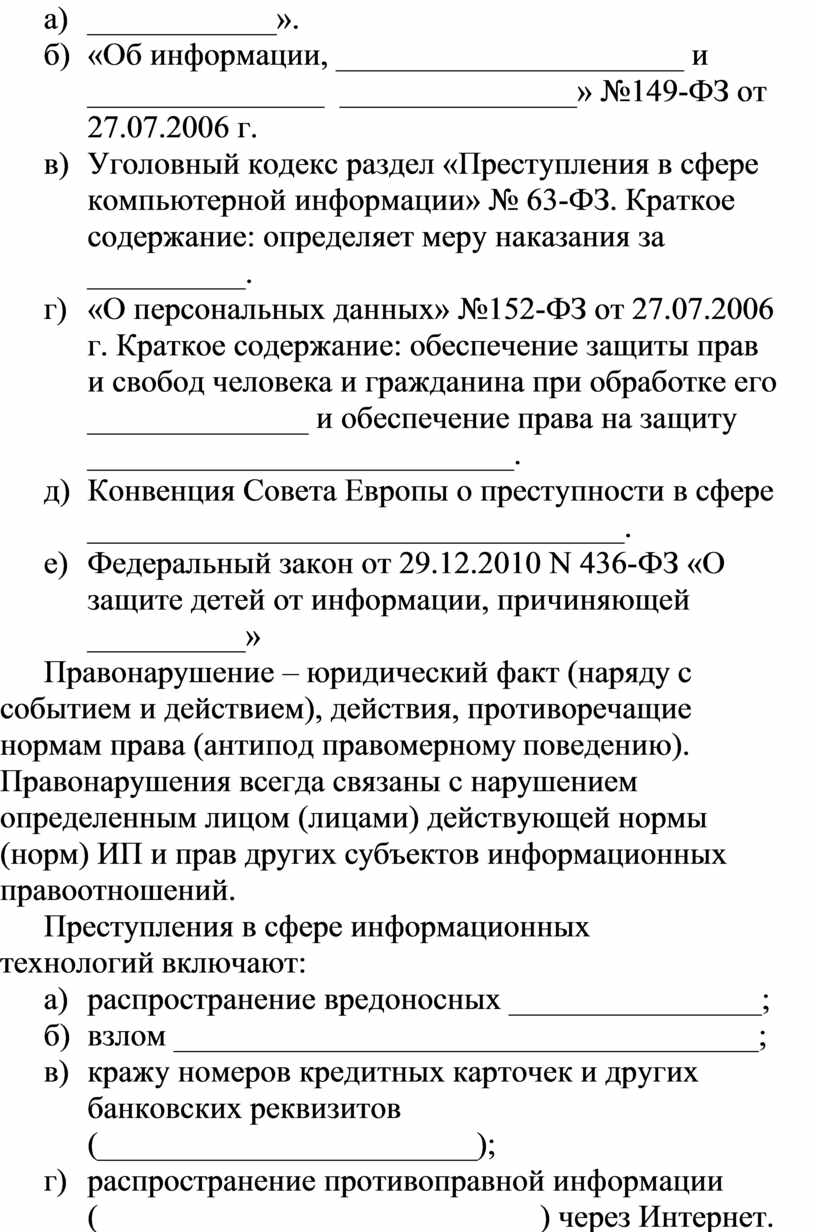 в) Уголовный кодекс раздел «Преступления в сфере компьютерной информации» № 63-ФЗ. Краткое содержание: определяет меру наказания за __________.