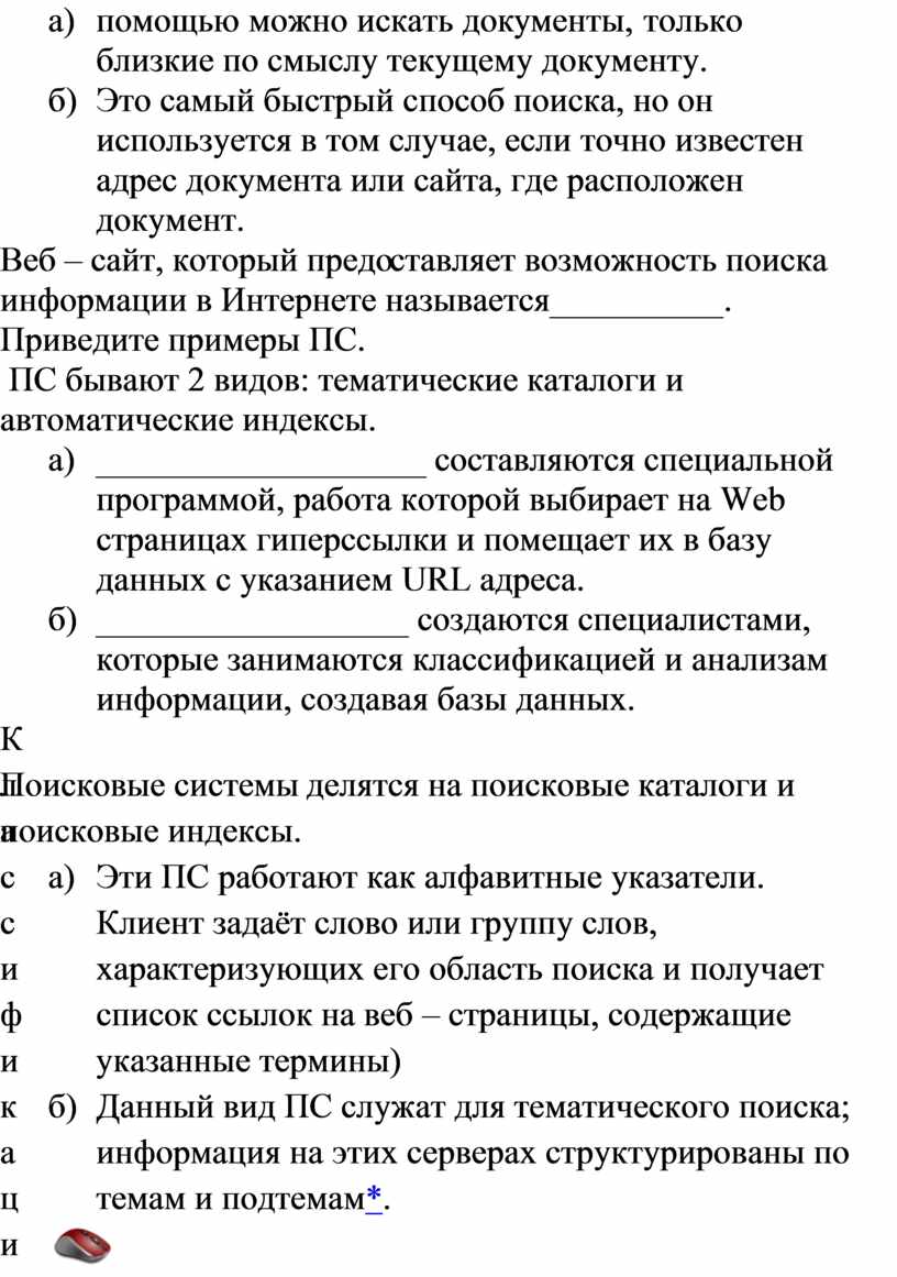 а) Эти ПС работают как алфавитные указатели. Клиент задаёт слово или группу слов, характеризующих его область поиска и получает список ссылок на веб – страницы, содержащие указанные термины)