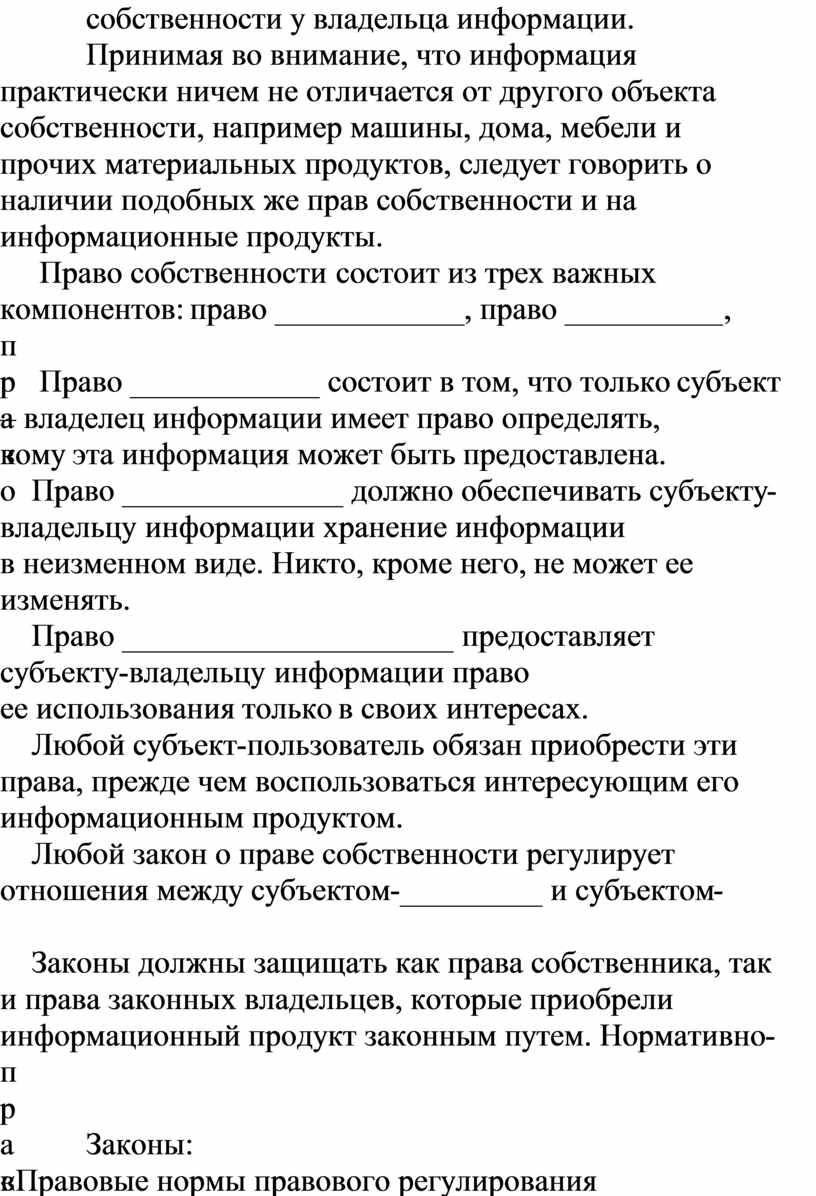Законы должны защищать как права собственника, так и права законных владельцев, которые приобрели информационный продукт законным путем. Нормативно-правовую основу юридические документы: __________, ______________, ______________, которые обеспечивают цивилизованные отношения на информационном рынке.