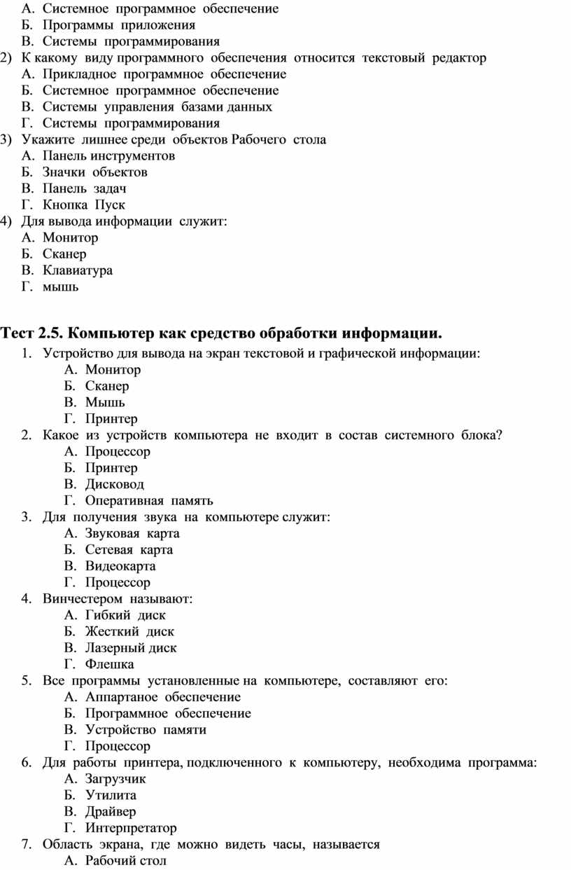 Тест 2.5. Компьютер как средство обработки информации.