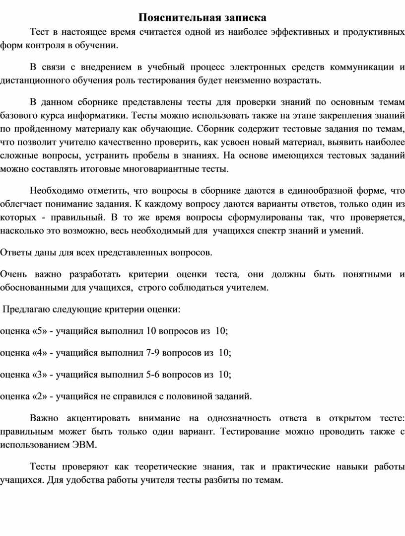 Очень важно разработать критерии оценки теста, они должны быть понятными и обоснованными для учащихся, строго соблюдаться учителем.