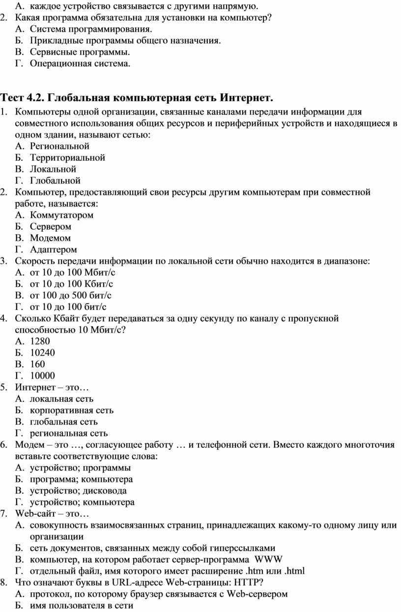 Тест 4.2. Глобальная компьютерная сеть Интернет.